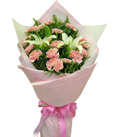 Pink carnations 16, white(or pink) lilies 2, with green leaves fully.